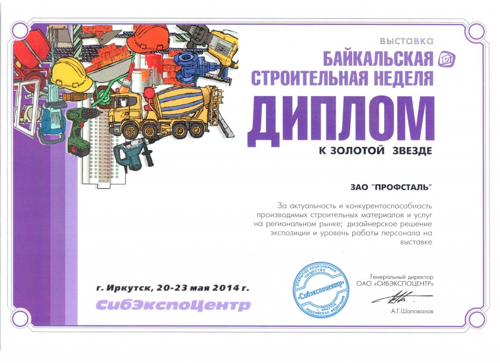 ![]() | C 20 по 23 мая в "Сибэкспоцентре" прошла выставка «Байкальская строительная неделя» 2014. Более 230 участников выставки разместили свои экспозиции в трех закрытых павильонах и на открытой площадке выставочного комплекса. Участники представили на стендах все необходимое для строительства, утепления, защиты, ремонта, отделки и декора — материалы, инструменты, технологии и услуги. Во время официального закрытия лучшим экспонентам вручили золотые и серебряные звезды, а также дипломы. АО "Профсталь" получила золотую звезду за актуальность и конкурентоспособность производимых строительных материалов и услуг на региональном рынке; дизайнерское решение экспозиции и уровень работы персонала на выставке. |